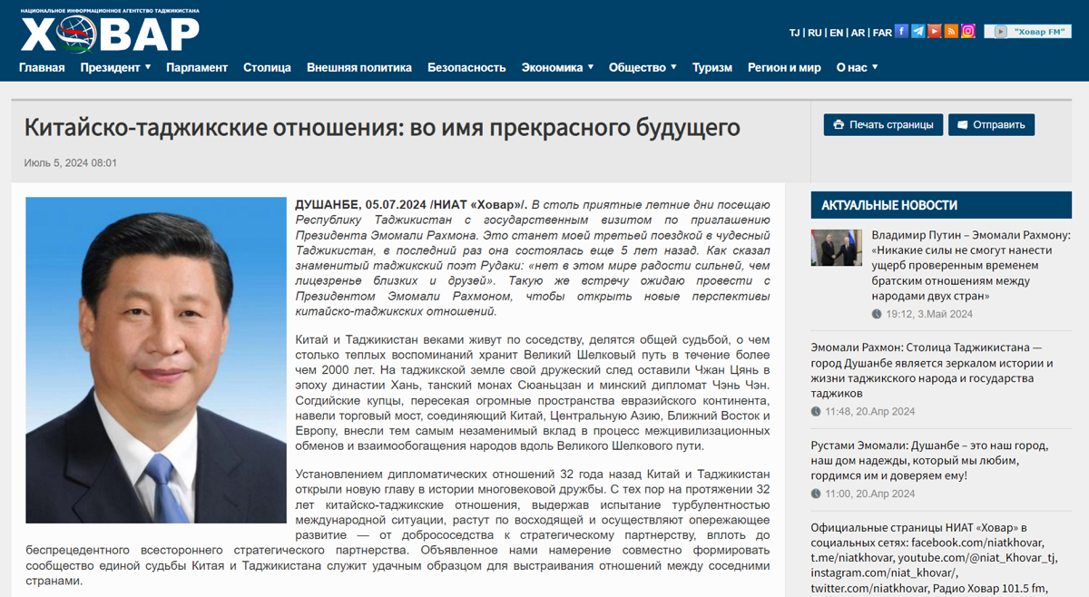 2024年7月5日,在對(duì)塔吉克斯坦進(jìn)行國事訪問之際,國家主席習(xí)近平在塔吉克斯坦《人民報(bào)》和“霍瓦爾”國家通訊社發(fā)表題為《共創(chuàng)中塔關(guān)系美好明天》的署名文章。
